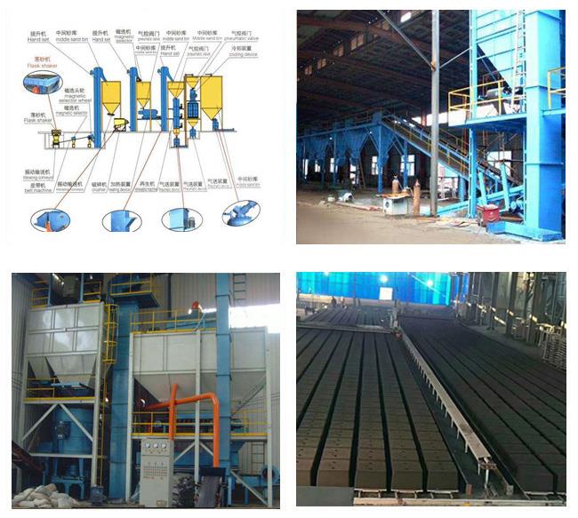 粘土砂生產線包含:振動輸送機、鑄型輸送、皮帶機、懸掛磁選機、提升機、精六角篩、砂庫、雙向皮帶機、沸騰冷卻床、提升機、再生機、皮帶機、提升機、卸料器、皮帶機、砂庫、圓盤給料機、皮帶機、提升機、皮帶機、排氣呼吸器、輔料斗、雙向給料機、螺旋給料機、輔料電子秤混砂機、皮帶機、圓盤給料機。